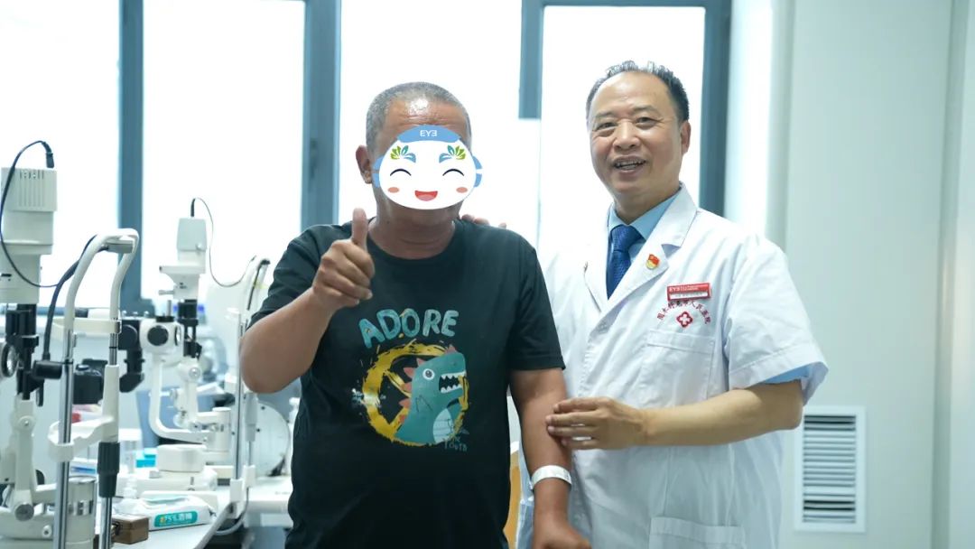 双眼白内障均很严重,且晶状体核硬、角膜透明性差,这无疑给手术带来了很大的风险和挑战。刘斐院长团队向色米及家属详细讲解手术及风险应对方案后,患者及家属的信心倍增,决定接受手术治疗。术后揭开纱布,重见女儿脸庞的瞬间,老人激动难抑,复查结束后,色米久久不愿离去,拉着刘斐院长合影留念。