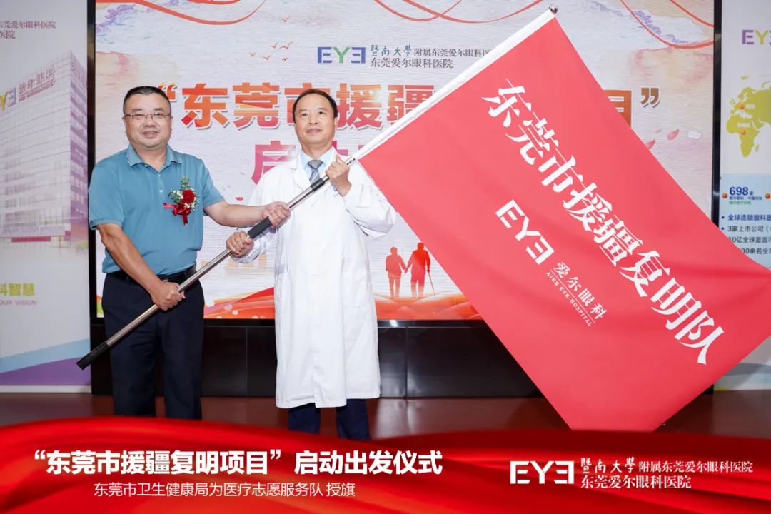 启动仪式上,东莞市卫生健康局三级调研员宋洪南为刘斐院长授项目队旗。随后,由医院党支部书记、总院长刘斐带领5名医务人员(其中3名党员)奔赴新疆图木舒克市,开展援疆复明工作。该项目将持续开展3年,期间,爱尔眼科医院将每年派出医护志愿服务团队到“师市总医院”进行医疗协助。