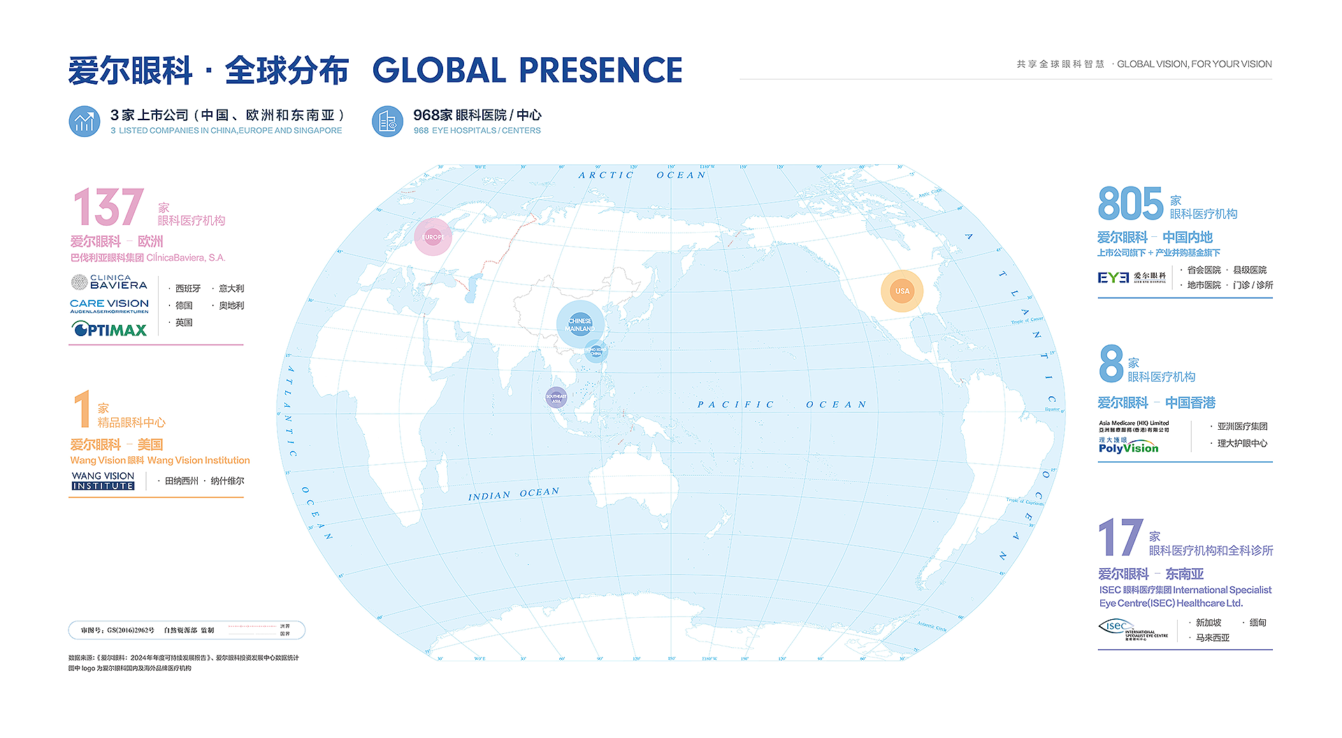 爱尔眼科创立于 2002 年,医疗网络布局亚洲、欧洲和北美洲,于 2009 年在中国深圳上市(股票代码:300015);公司在欧洲、东南亚的分支机构分别在西班牙马德里(CBAV.MC)、新加坡(SGX:40T)上市。截至 2025 年 7 月 31 日,爱尔眼科品牌医院、眼科中心及诊所在全球范围内共有 968 家。其中,中国内地 805家,中国香港 8 家,在海外布局突破 155 家眼科诊所,包括美国 1 家,欧洲 137家,东南亚 17 家。