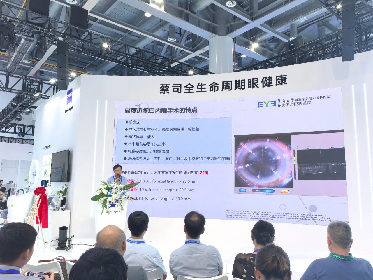 屈光性白内障手术 的精准实践与创新分享 随着人口老龄化加剧,老视、高度近视合并白内障患者数量持续增长,“术后脱镜”成为患者核心诉求。东莞爱尔白内障科谭泳昌主任围绕这一临床重点,在大会多个关键平台展开深度分享: 在“高度近视白内障论坛”蔡司展台发表专题报告《突破高度近视壁垒:三焦点散光矫正型人工晶状体临床实践》,谭泳昌主任针对老视患者增多与脱镜需求提升的临床现状,系统介绍了白内障合并角膜散光的手术策略。通过典型高度近视病例,他全面阐释了东莞爱尔在屈光性白内障手术中的全程精细化管理的理念与实践,以“慎于术前、精于术中、勤于术后” 的全周期管理,帮助高度近视白内障患者突破视力壁垒。 在爱尔康展台,谭主任进一步带来《焕新视界·全程清晰——爱尔康全新三焦点人工晶体的临床应用》主题发言。他强调飞秒激光辅助白内障手术在处理高度近视、水眼、硬核、晶体脱位等复杂病例中的显著优势,并指出全新Clareon PanOptix人工晶状体可为患者提供高质量全程视力,是实现脱镜愿景的重要选择。此外,他还就网脱术后及高度近视患者植入屈光性IOL的可行性分享了临床见解,为临床诊疗提供重要参考。