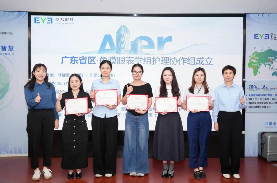 爱尔眼科医院集团广东省区角膜及眼表学组护理协作组正式成立。叶健章、何曼莎担任协作组指导专家,广州爱尔钟小凤担任组长,东莞爱尔梁妙兴、广州爱尔彭燕担任副组长,省区各医院护理骨干任协作组成员,并由广东省区护理总监助理张海花颁发聘书。