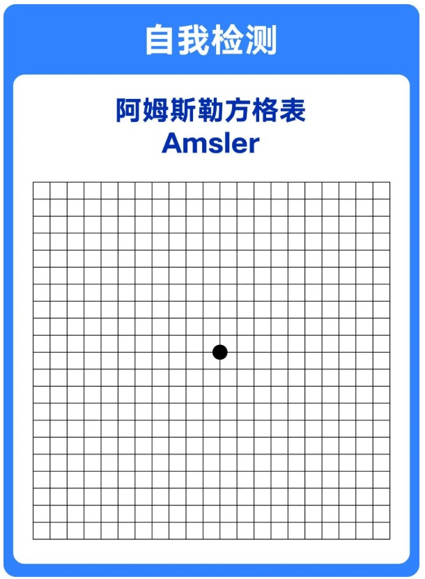 阿姆斯勒方格表:每月使用阿姆斯勒方格表进行自查。将方格表放在视平线30厘米处,光线要充足均匀。如有老花或近视,需戴原有眼镜。遮盖一只眼睛,凝视方格表中心的黑点,然后交替检查另一只眼睛。如果发现方格表中心区域出现空白、曲线或暗点,可能是黄斑病变的征兆,建议尽快就医。