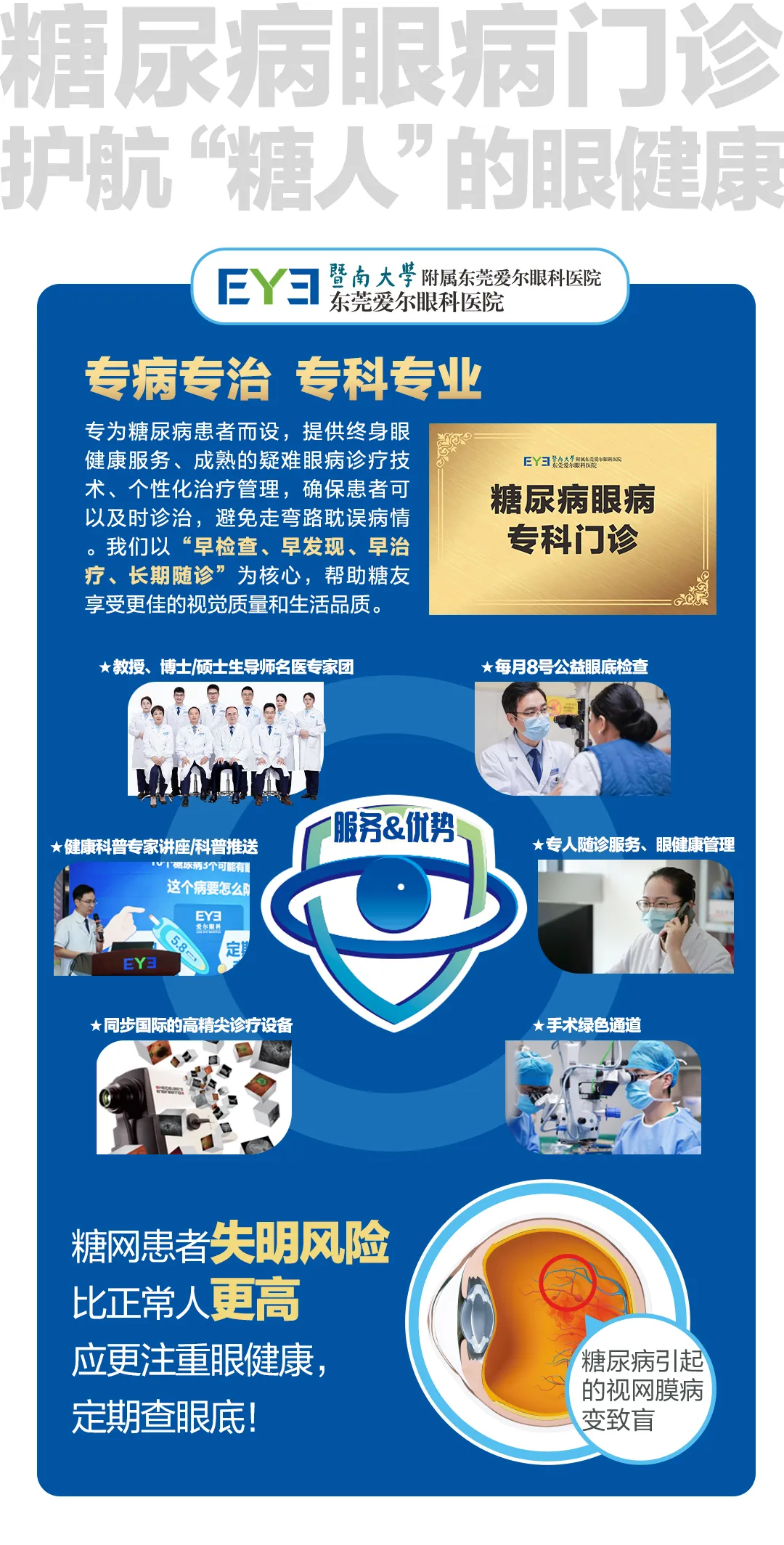 东莞爱尔眼科医院专为糖尿病患者设立糖尿病眼病门诊,为糖友提供终身眼健康管理服务:抗VEGF注药、激光光凝、玻璃体切割术等多技术联合干预的个性化治疗,以及个案管理师跟踪患者血糖及视力变化,提供用药及生活方式指导的终身随访服务,确保患者可及时就诊,享受更佳的视觉质量与生活品质。