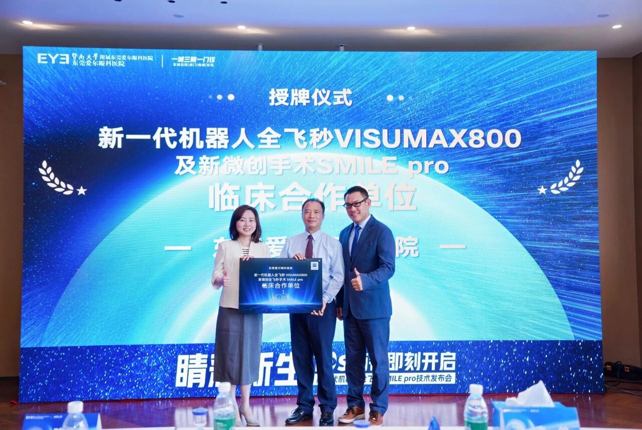 本次发布会以该技术“超快、智能、更安全”为核心亮点,特邀广东省医师协会委员、广东省区第二届学术委员会委员、爱尔眼科东莞总区域院长刘斐,全球SMILE手术官方认证医师、全国眼内镜矫治青年专家协作组组员、东莞爱尔眼科屈光科主任陈晓蓓,东莞爱尔眼科医院CEO程雪女士,以及蔡司公司代表王木生先生、李单先生出席,共同见证屈光手术领域这一里程碑式突破。