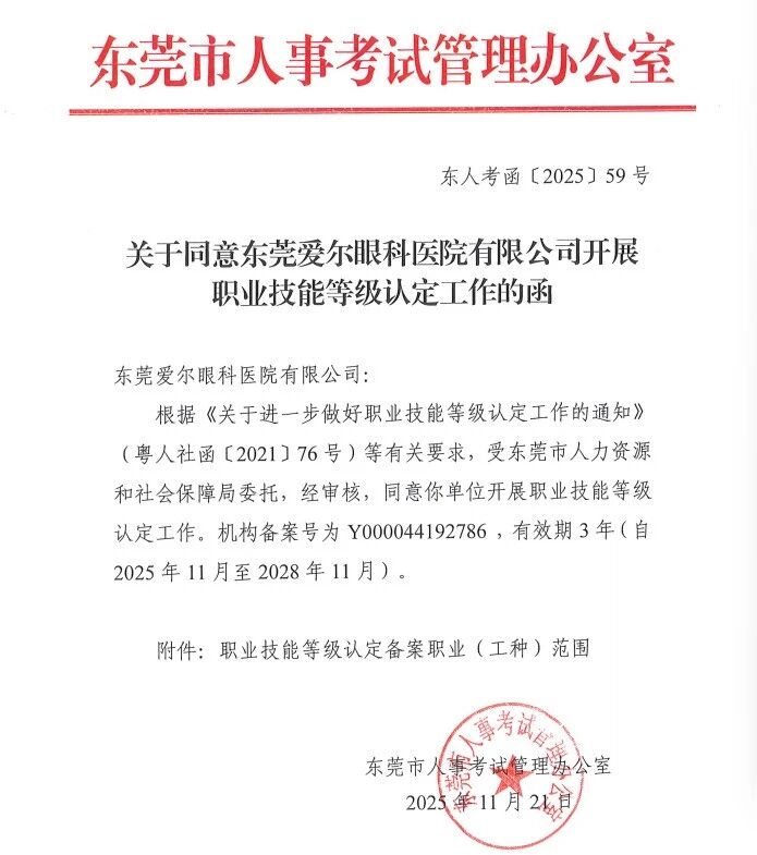 近期,东莞爱尔眼科医院经东莞市人力资源和社会保障局委托审核评估,成功斩获职业技能等级认定工作资质!这不仅是对医院专业实力的高度认可,更将为东莞配镜行业的规范化、高质量发展注入强劲动力,切实守护广大市民的眼健康权益。