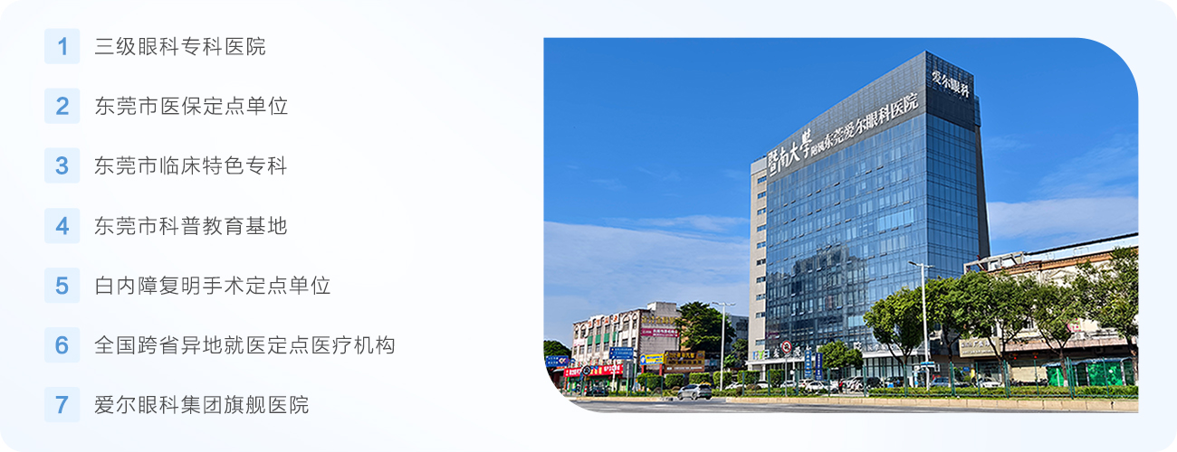 东莞爱尔按照“做专业、做品质”的发展定位,着力打造国际门诊、遗传性眼病门诊、高度近视专家门诊、青少年近视防控门诊、糖尿病眼病门诊、老花白内障门诊、干眼诊疗特色门诊、巩膜镜技术诊疗门诊、视觉康复及训练门诊、葡萄膜炎门诊、儿童干眼门诊、国际眼内镜近视手术门诊、甲状腺眼病门诊等专病特色门诊;开设视网膜脱离24小时急救绿色通道、眼外伤急救绿色通道、青光眼24小时就医绿色通道、眼科24小时急诊服务等,提供精准的眼病检测、预防、控制于一体的全方位眼病诊治方案及管理跟踪服务。在长期的临床实践中,东莞爱尔以独到的医术、精细的服务处处彰显“爱尔眼科 共享全球眼科智慧”的鲜明特色。